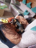 Maar alle andere lekkernijen zijn ook erg gewild: hertenbieten, garnalen enz. Ik heb nu Dentax geprobeerd tegen tandsteen en ik moet zeggen dat zijn tanden weer bijna glanzend wit zijn, op een paar donkere plekjes op zijn hoektanden na, maar hij krijgt het nog steeds. Dentax bespaart een algehele narcose voor de gebitsreiniging bij de dierenarts.